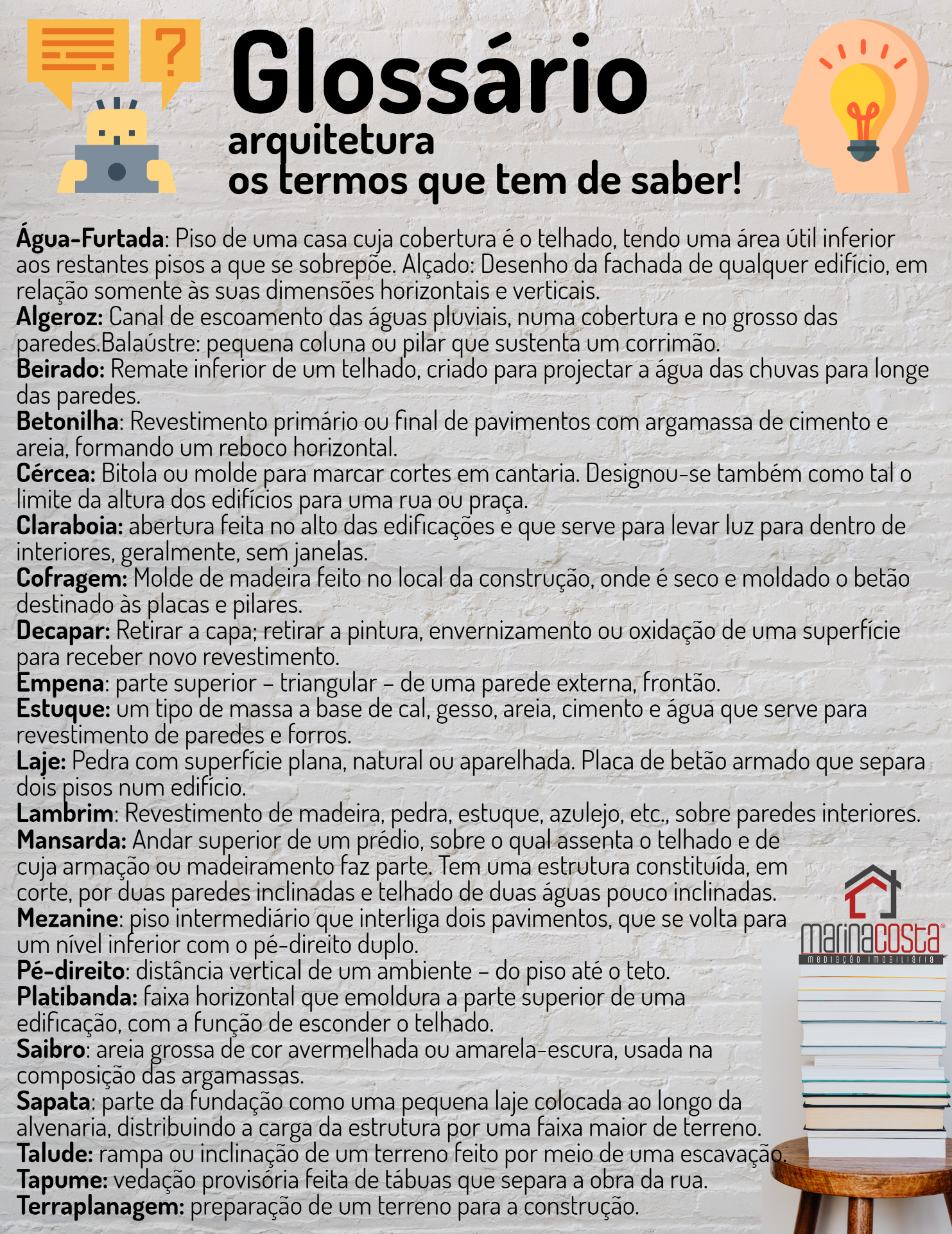 Seja para quem vai construir ou comprar casa ou até mesmo para quem é consultor imobiliário, entender a linguagem dos arquitetos, técnicos e engenheiros é por vezes um quebra-cabeças. Por mim falo, entender e depois explicar convenientemente os termos aos clientes obriga-me muitas vezes a googlar por segundos ou fazer um telefonema a quem domina o assunto. Para evitar que tenham de passar pelo mesmo ou terem de se matricular num curso intensivo de arquitetura ou engenharia, deixo-vos aqui um pequeno glossário com alguns dos conceitos que mais ouvimos e que importa perceber na verdade a que se referem. Assim quando alguém os mencionar, já podemos fazer um ar de entendidos ao invés de ficarmos com aquela cara de quem não entende mandarim.
